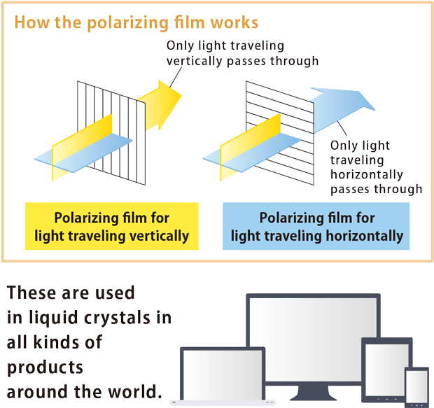 A polarizing film is an optical film that allows the display to show its image by controlling the amount of light. Its performance is an important factor affecting the image quality of the screen. Nitto’s polarizing film is the world’s top level technology, contributing to thinner, larger, and high image quality liquid crystal displays. It is used in many of the LCD screens in the world including smartphones, tablet PCs, TVs, and vehicle displays and continues to evolve as the devices themselves evolve.