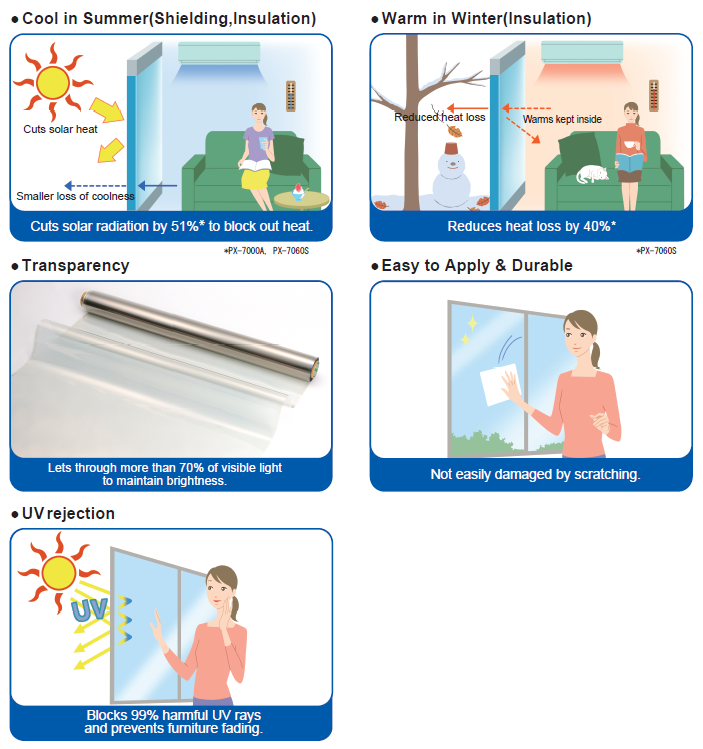 PX-7060S 可減少大約 50% 的光照,在酷熱的夏天可提高冷卻效率,以及阻擋 99% 以上的有害紫外線。