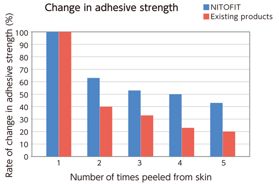 如果將暖身貼反復剝離/粘貼到皮膚上,角蛋白、汗液和其他物質會粘附在粘合劑表面,從而導致暖身貼粘合強度降低。 NITOFIT 具有持久的粘合強度。