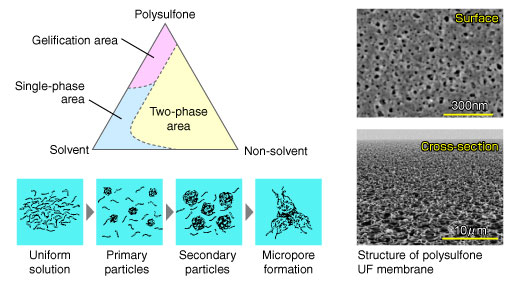 超濾 (UF) 膜、微細過濾 (MF) 膜和其他聚合物分離膜的制造方法結合了基于相位分離、取向和蝕刻的方法。 Nitto Denko 通過一種稱為非溶劑誘導的相位分離 (NIPS) 生產聚砜 UF 膜。 如下圖所示,使用非溶劑形成聚砜和溶劑的成膜形溶液時發生了相位分離現象,從而形成了多孔結構。