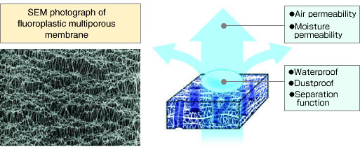 氟塑料(如 PTFE),作為多孔物質的原材料,使用少量但足以形成原纖維(細長纖維)的剪應力,以迅速形成原纖維為特點。 當這些原纖維融合并交織在一起時,便形成了多孔結構(膜)。