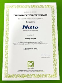 Nitto Denko UK Ltd. 已向一家非盈利非政府組織 EFORESTS 開展的企業植樹項目捐款。 種植的每顆樹木都已獲得證書,并分配獨一無二的編號。員工參觀了植樹的森林,共同探討了環境問題。