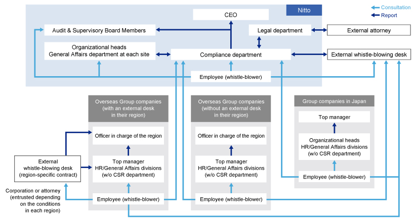 我們正在通過實施適用于集團所有員工的“吹哨”制度,最大程度確保及早發現違法行為和道德問題。我們為業務合作伙伴提供合作伙伴熱線,以就涉及與 Nitto Group 交易的不合規或疑似不合規事件尋求咨詢。