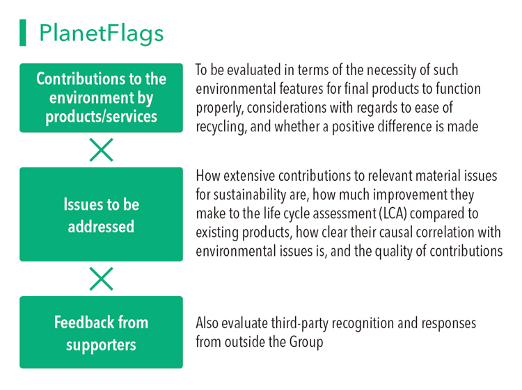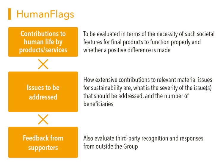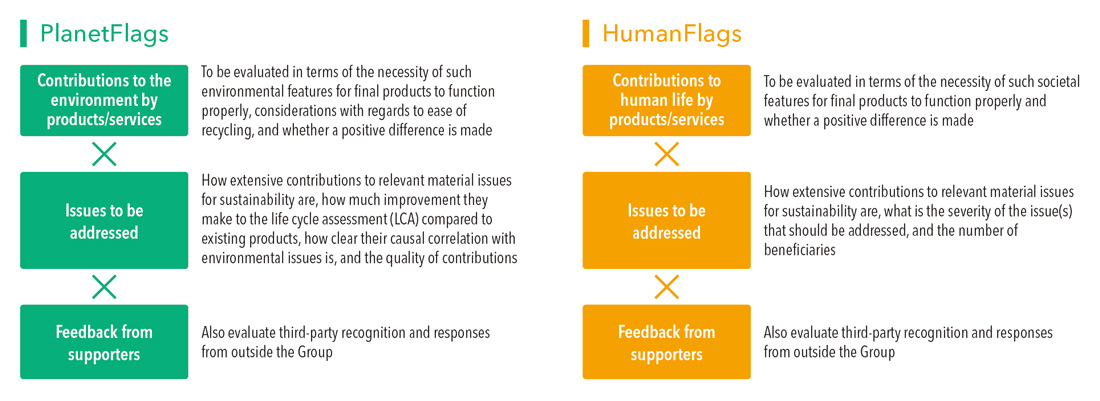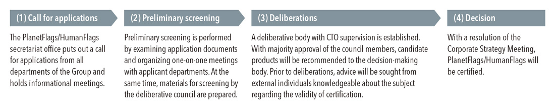 The PlanetFlags/HumanFlags Recognition Scheme is a new initiative for visualizing products that contribute to the process of co-creating value through innovation, which is one approach of the material issues for sustainability. Under the scheme, the Nitto Group's products are assessed according to our unique standards from the two perspectives of contributions to the environment and human life. Products that are recognized as making particularly significant contributions are certified as either a PlanetFlags prodcut or a HumanFlags product. These recognition standards are also reflected in the selection of future projects in the development process. By allocating our R&D resources preferentially to products that are expected to receive recognition as PlanetFlags/HumanFlags, we will advance our efforts to simultaneously solve social issues and create economic value through business.